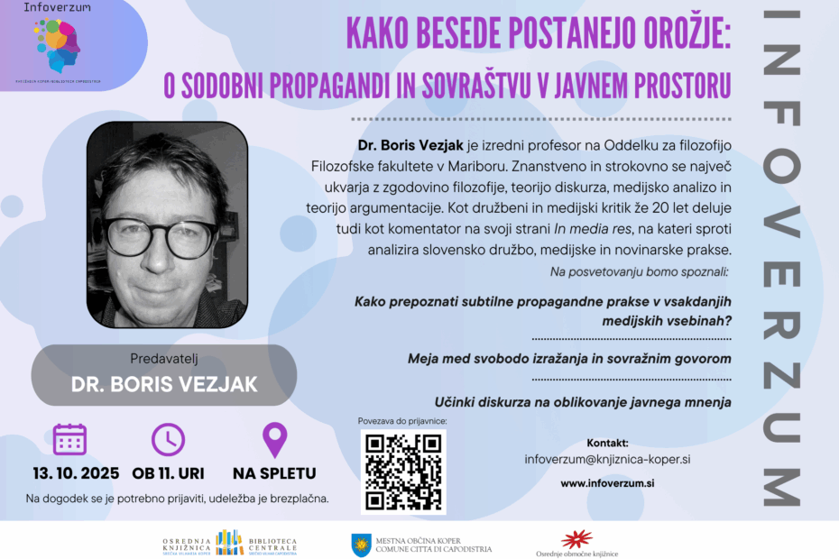 Osrednja knjižnica Srečka Vilharja Koper vas vabi na zadnje predavanje letošnjega Infoverzuma, ki bo potekalo 17. 11. 2025 ob 11. uri v spletnem okolju. Prisluhnili bomo mladi raziskovalki, ki se ukvarja… Preberi več »Vabilo na zadnje letošnje srečanje